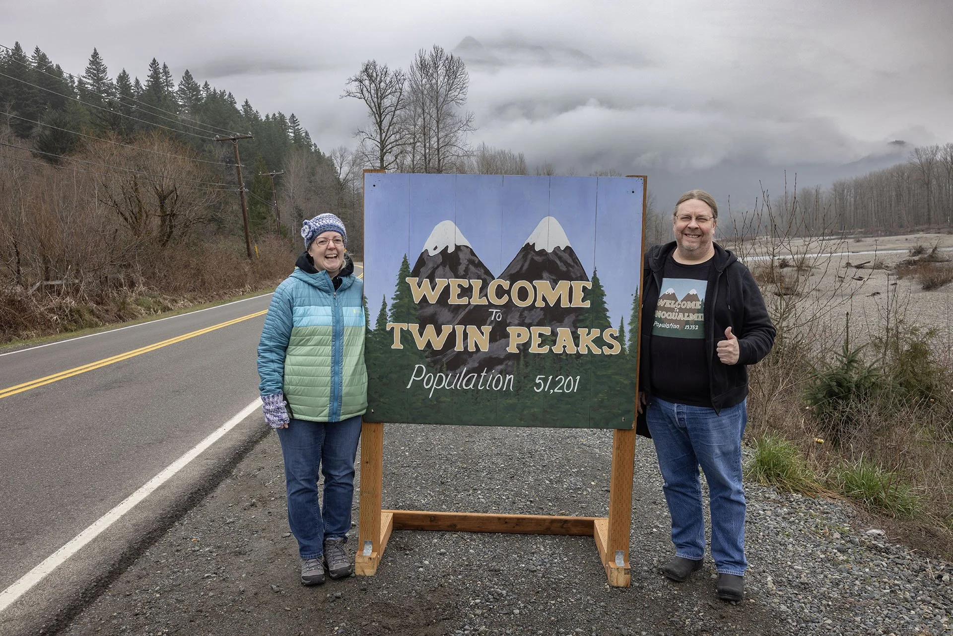 Local super-fan Karl Reinch and his wife Marisa pose by the “sign spot” on Twin Peaks Day 2026.