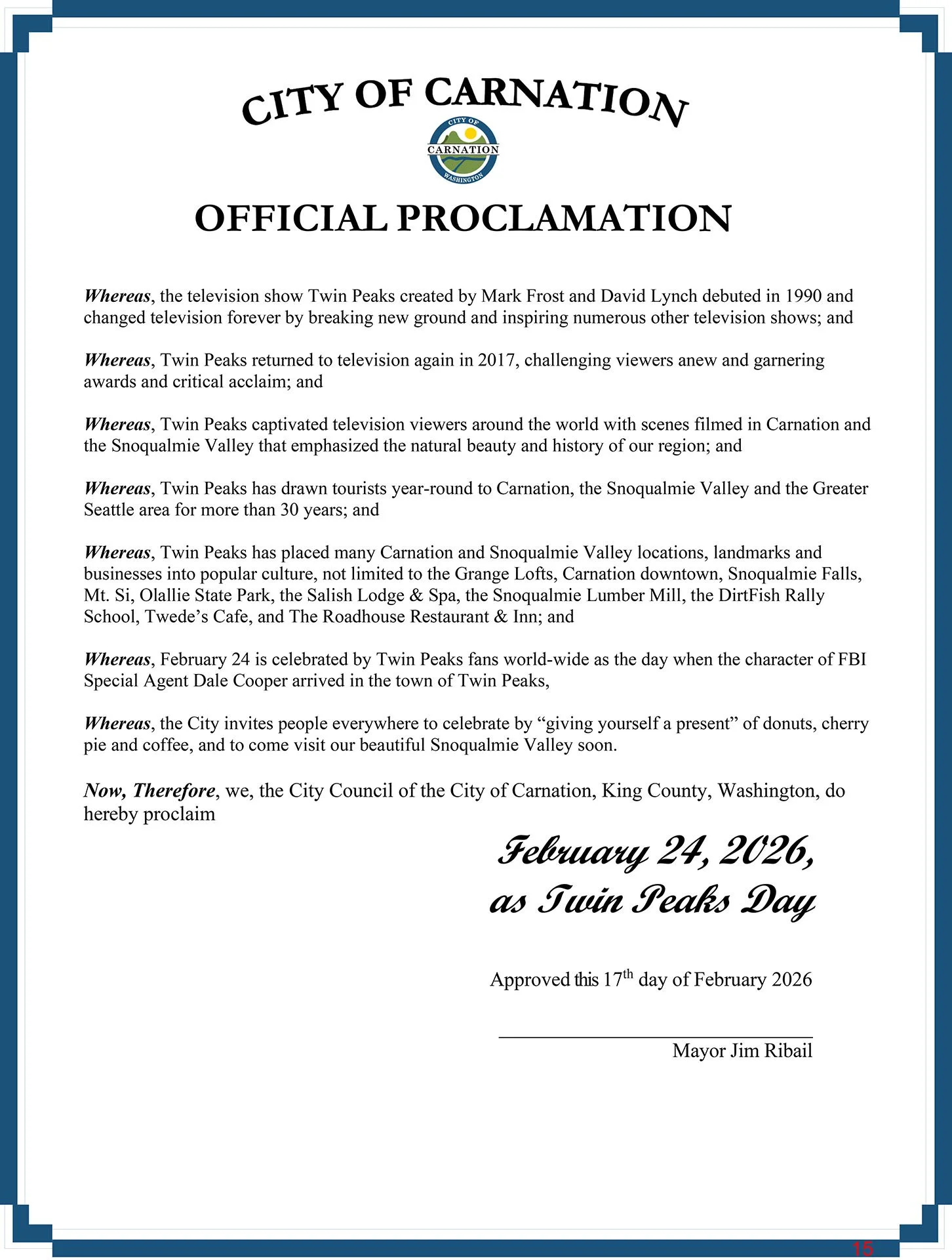 Since 2018, Karl has drafted Twin Peaks Day proclamations for local governments in Washington state to acknowledge this important day in the fan community. In 2023, the town of Carnation also joined in the Twin Peaks Day fun as several scenes from the Pilot were shot in the town. Carnation’s downtown is also seen outside the Double R Diner windows throughout Season 2.