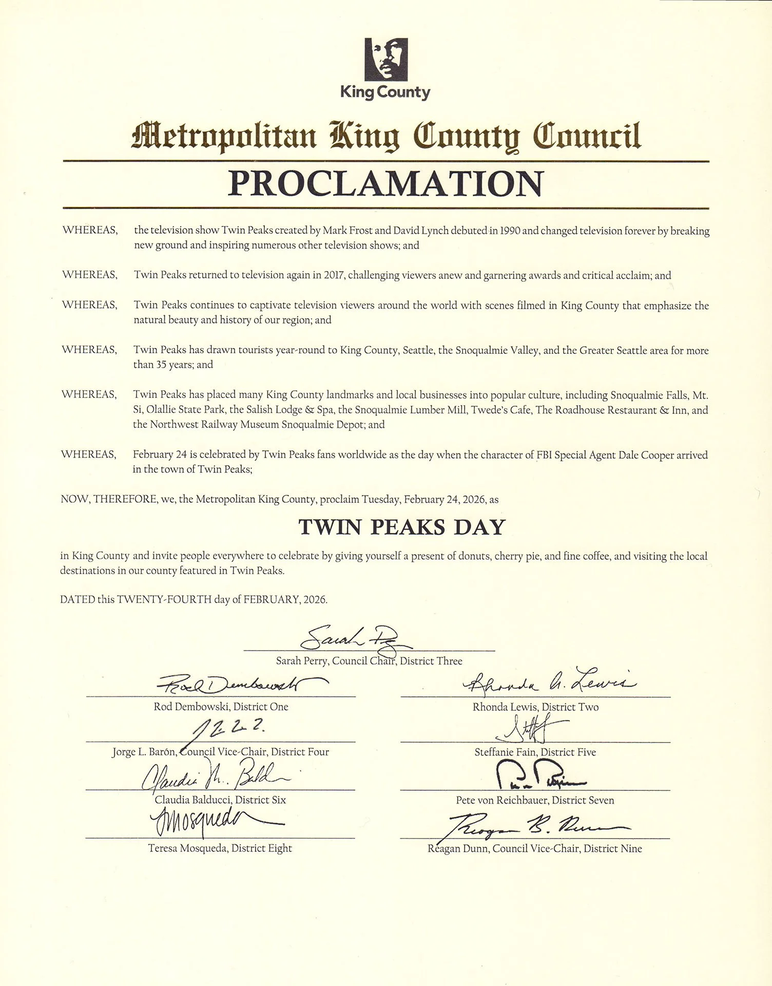 2026 Twin Peaks Day ProclamationOn February 24 at 11:30 a.m., Special Agent Dale Cooper enters the small Pacific Northwest town of Twin Peaks to investigate the murder of Laura Palmer. This is one of the few dates mentioned in David Lynch and Mark Frost’s wonderful and strange series.